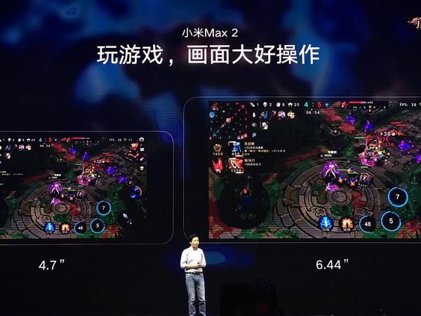 首先雷军表示屏幕不是越大越好,选择合适的屏幕很难,小米Max 2屏幕尺寸仍然为6.44英寸,这也是大屏的黄金尺寸,单手可握持但又足够大。看视频时画面体验感更好,在玩游戏时更爽,此时王者荣耀登场,雷军表示用大屏玩游戏赢的概率更高。