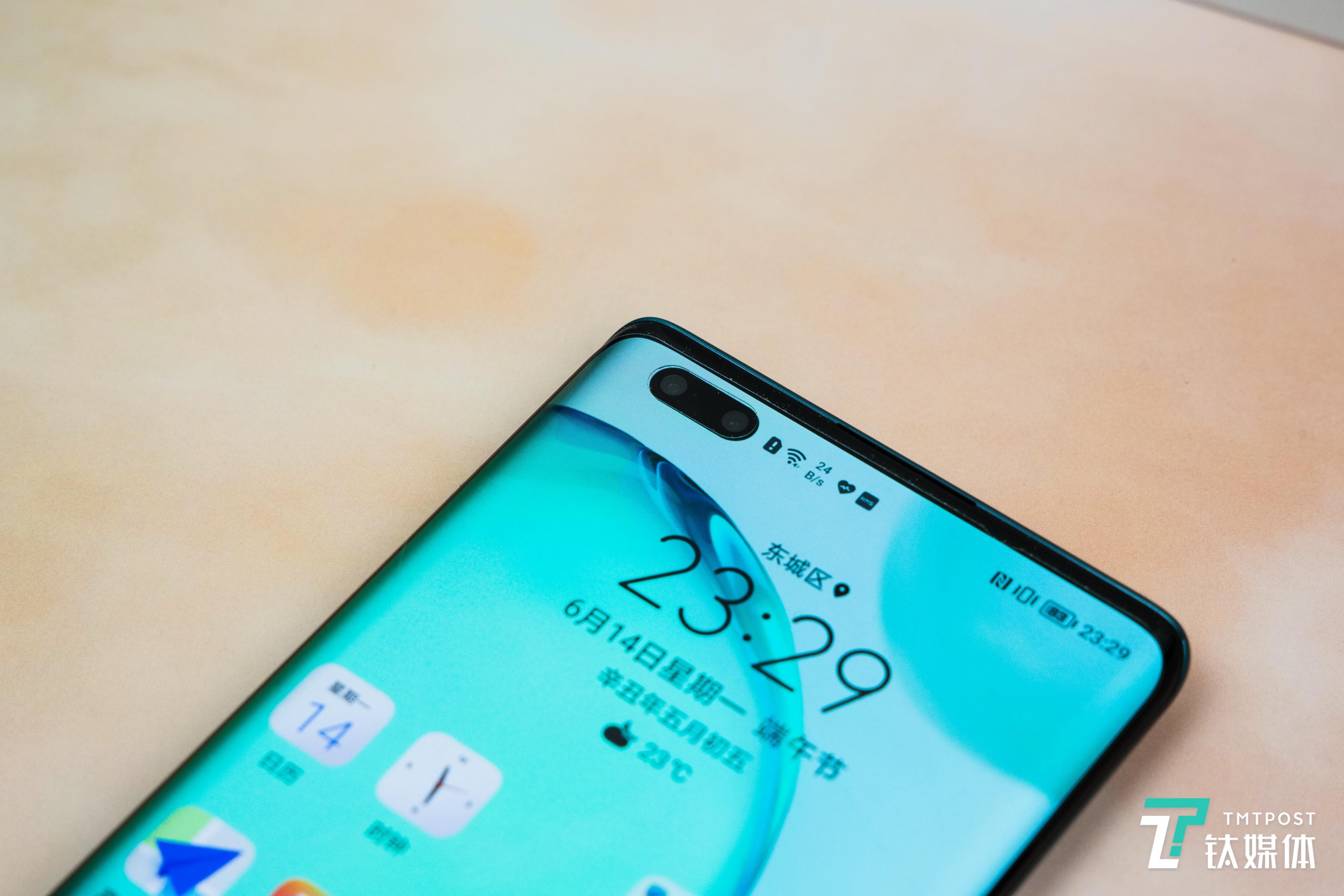 屏幕的左上角的挖孔为前置双摄组合——1200万视频摄像头+3200万高清摄像头的设计,并且支持三挡智能切换:竖屏自拍,1人自拍78°广角,2人自拍90°广角,3人及以上入镜自拍100°广角;横屏自拍默认90°广角,3人及以上入镜自拍100°广角。
