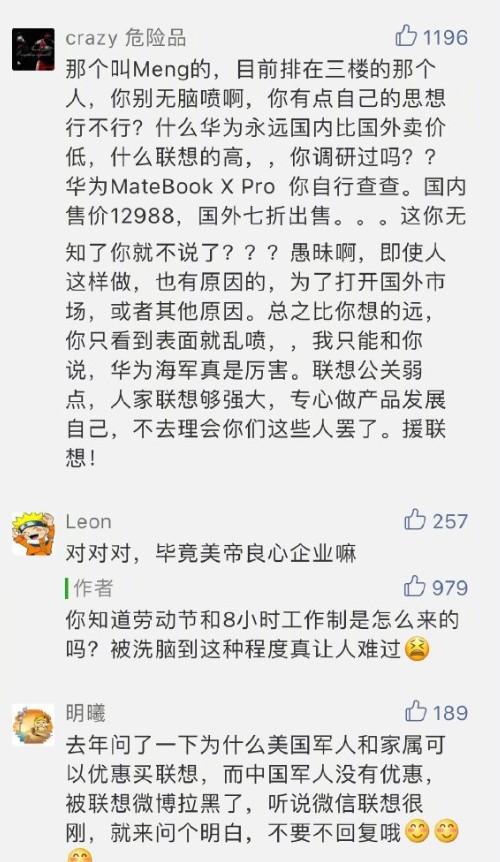 在评论中有网友表示为什么联想没有996,因为联想是美国企业。对此,联想官方表示:“尊重中国的劳动法就是美国企业了?现在的人都是怎么了?”
