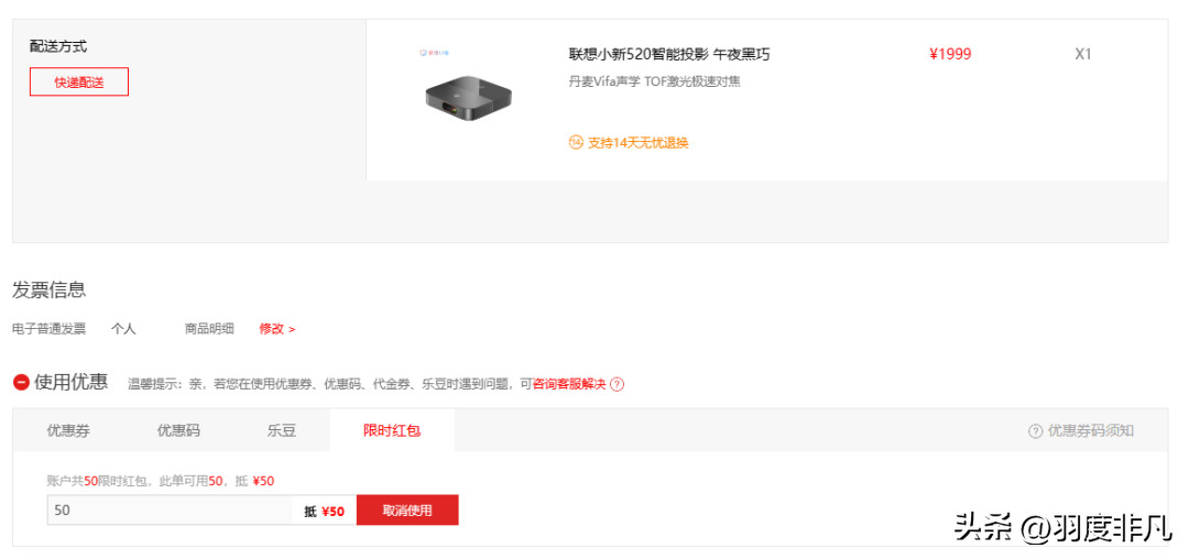 不过这并不是联想给出的最低价,因为除了产品本身的降价优惠之外,联想官方商城还为所有用户准备了其他的各种抵扣券,开场即送50元的无品类门槛抵扣券,所有联想官方商城的用户都可以领取,不过需要提醒的是虽然这张抵扣券可以不限品类使用,但在额度方面是有限制的——最多不超过订单金额的10%,例如我要购买一款1999元的联想小新520智能投影,那么这50元抵扣券是可以全部使用的。