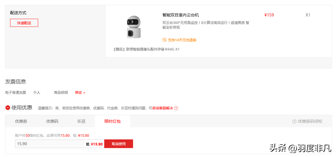 但如果我要购买一台价格159元的智能双目室内云台监控,那么这张50元的抵扣券只能使用159元的10%,也就是15.9元,不过剩下的34.1元抵扣券后续还是可以继续使用的。