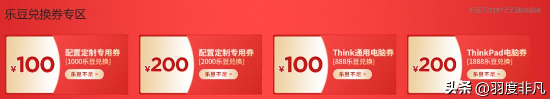 除了无品类门槛抵扣券之外,联想官方商城的乐豆积分也可以进行“翻倍膨胀”了,最低可以获得10倍膨胀,最高可以获得50倍的膨胀,而乐豆是可以直接抵扣现金的,正常情况下是100:1的抵扣比例,现在双十一期间,联想也提供了一些特定的乐豆抵扣券,抵扣比例也更高,例如Think品牌的电脑或ThinPad电脑分别可以以888乐豆兑换100元优惠券、1888乐豆兑换200元优惠券。