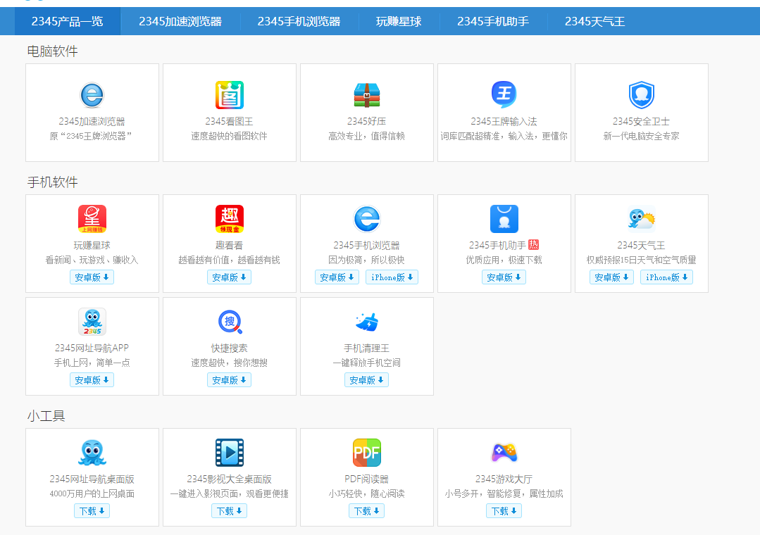随着技术联盟的发展缓慢,2345又开始利用多特下载站,对其提供的软件进行捆绑,稍有不小心,电脑轻则被劫持浏览器,多则全家桶开始安排,为了让全家桶丰富一点,2345开发了2345浏览器,2345看图王,2345好压,2345输入法,2345安全卫士等等电脑和手机端软件。