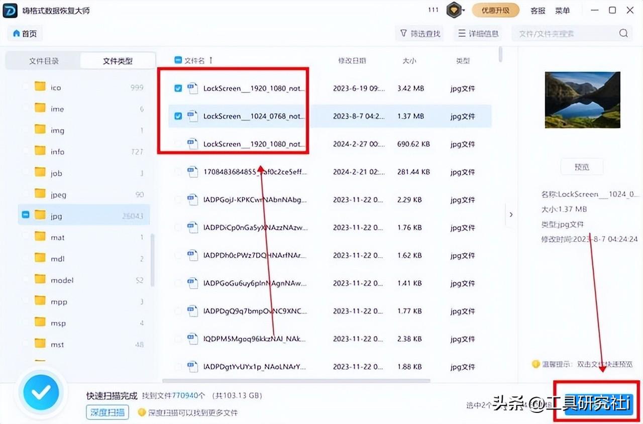 4、预览并恢复文件:扫描完成后,软件会列出找到的所有可恢复文件。勾选需要恢复的文件,点击“恢复”按钮即可。