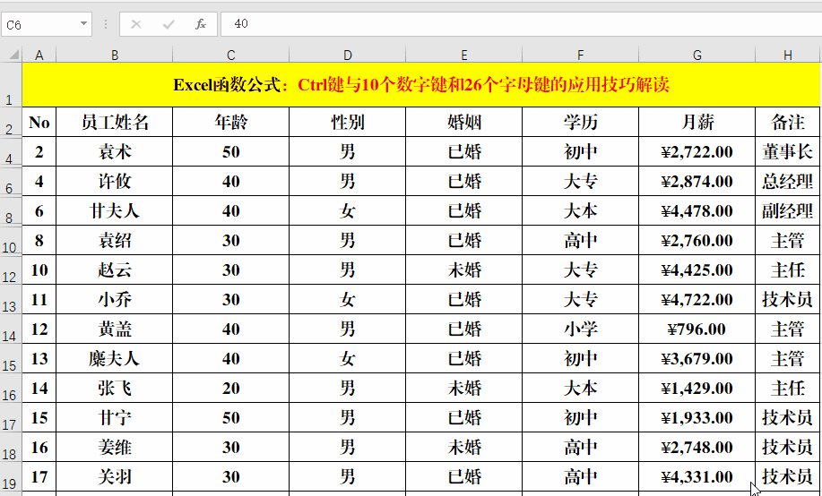 在第一个目标单元格中输入“袁术董事长”的简称:“袁董事长”,选定所有目标单元格区域,包括已经输入值的单元格,快捷键Ctrl+E,智能填充。