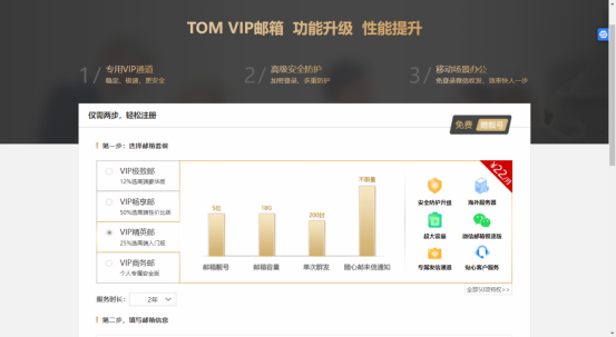 开始注册邮箱的时候,首先要选择你所需要的邮箱级别,不同级别对应的功能也是不同的,比如说群发邮件的数量、邮件撤回的数量、附件保存的时间,邮箱容量等等。其次就是注册时填写的信息,就按照注册页面的提示填写就可以,必须要填写的就是你的手机号、邮箱账号等,提前提醒一下大家呦,邮箱账号设置好就不能更改喽~且账号是独一无二的!