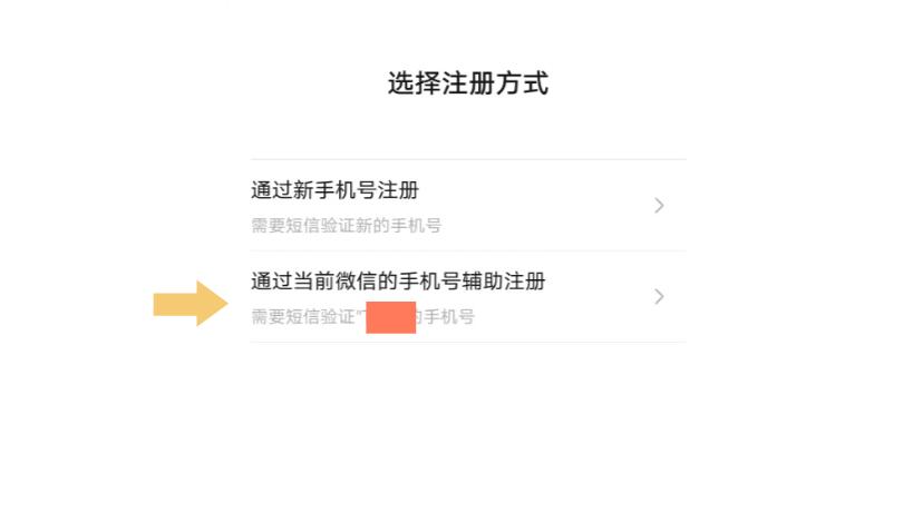 点击添加账号,在弹出的界面里会看到“注册”信号的两种方式,分别为通过新手机号注册,以及通过当前微信的手机号辅助注册。如下图: