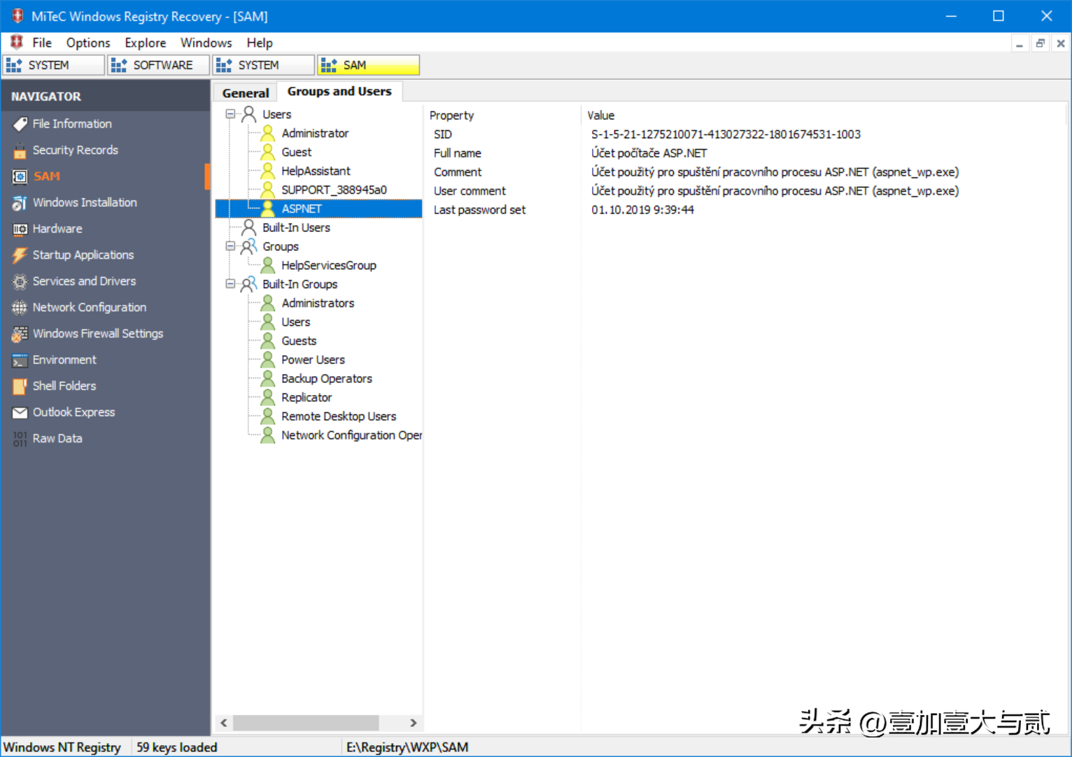 显示机器SID和部分SYSKEY。枚举本地用户和组帐户及其部分属性。此资源管理器仅适用于基于NT的系统注册表SAM hive。