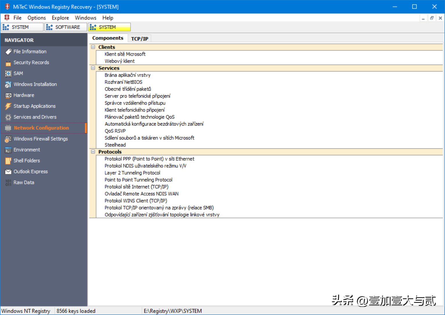 显示所有已安装的网络客户端、协议和服务。枚举所有定义的网络连接及其TCP/IP配置。此资源管理器仅适用于基于NT的系统注册表SYSTEM hive。