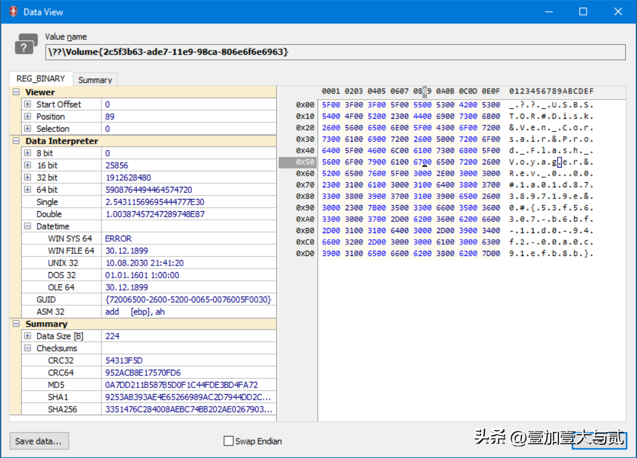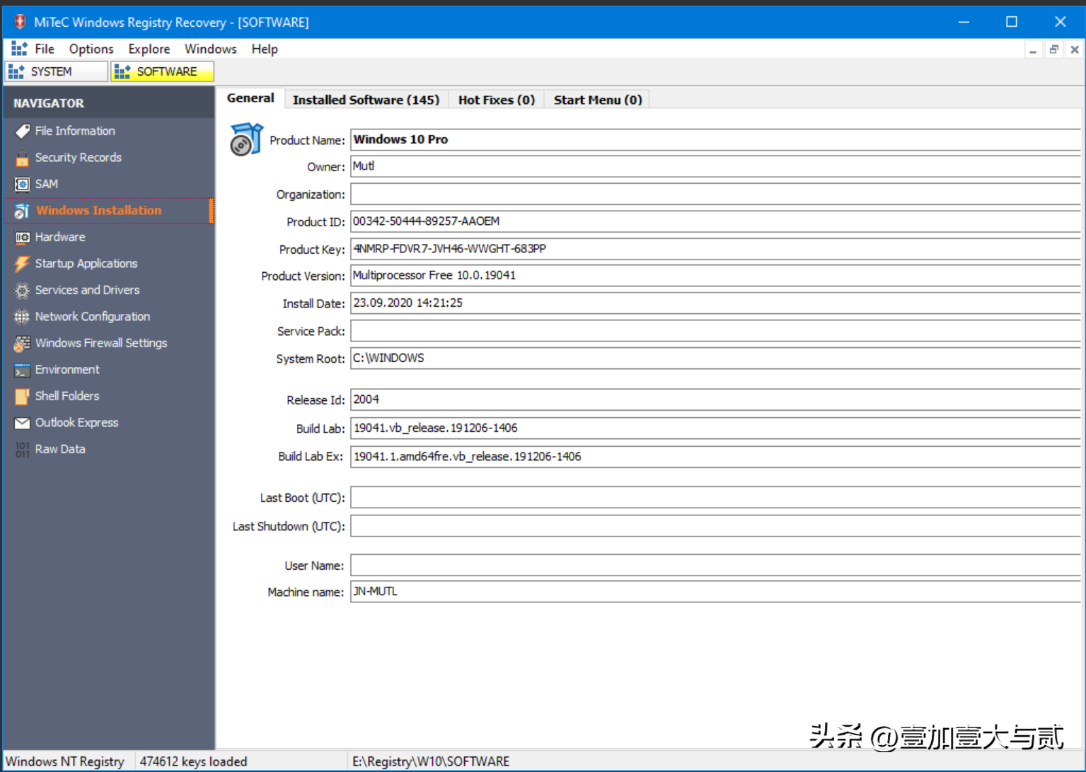 显示Windows名称、ID和密钥、安装日期和用户注册信息。枚举安装的软件及其描述和安装日期以及已安装的修复程序列表及其描述。此资源管理器仅适用于SOFTWARE注册表hive(产品ID和密钥也在SYSTEM注册表hive中提取)。最后一次启动和关闭的日期时间仅从SYSTEM注册表hive中提取。还显示所选用户注册表hive的用户和计算机名称以及基于树形的开始菜单。此资源管理器适用于USER注册表hive。
