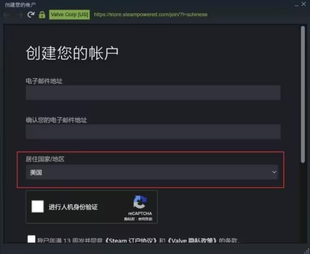 在Steam客户端的登录页面,点击“创建免费账号”。根据页面的提示,填写你的个人信息。尤其要注意填写“居住国家/地区”,因为这将决定你的Steam账号归属哦!