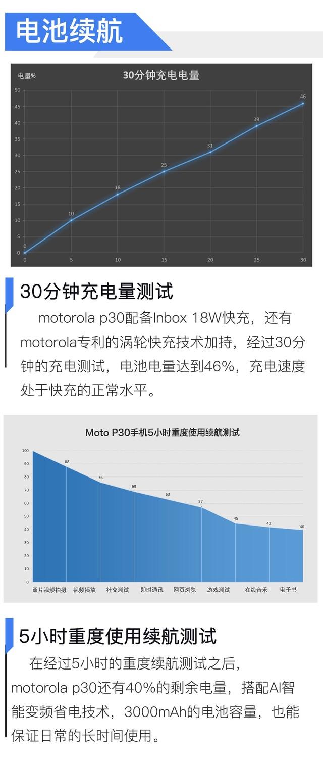 经过测试,motorola p30手机在安兔兔软件上跑分达到113147分,3D Mark软件上测试分为19812分,Geekbench软件上单核跑分为1335分、多核跑分为4950分。