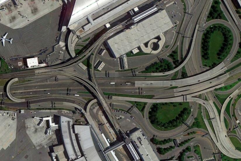 从鸟类飞行的高度看曼哈顿,红色屋顶的大楼,是联邦储备银行。