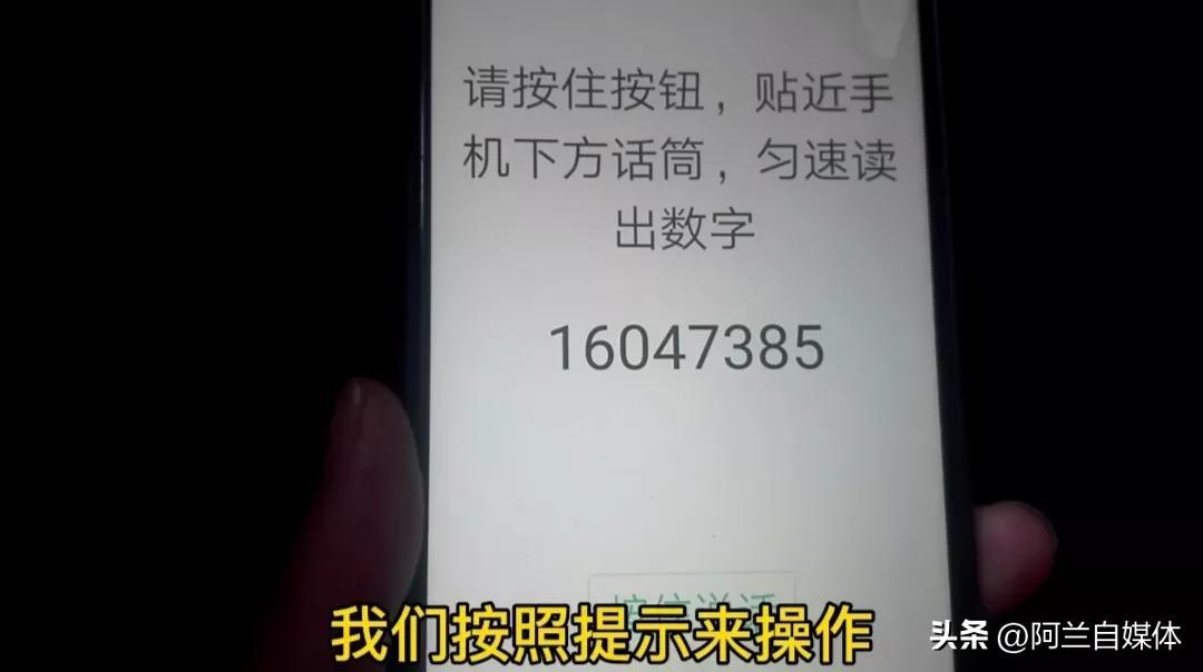 注意看上方也有提示,我们按照提示来操作,长按着下方绿色的按钮,然后读出数字就OK了。我们用手指长按,读出“16047385”,已完成第一步,我们点“下一步”!