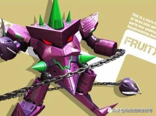 这是贼眉鼠眼的魔动王,这个果宝机甲一身葡萄紫色,看上去有些神秘感,再加上充满朋克风的绿色尖刺,让人一下子联想到街头那些留着杀马特造型的小混混。