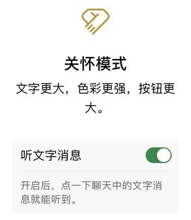 据悉,开启关怀模式,再调节“听文字消息”按钮到开启状态,点一下聊天中的文字消息就能听到。(来源:新浪科技)