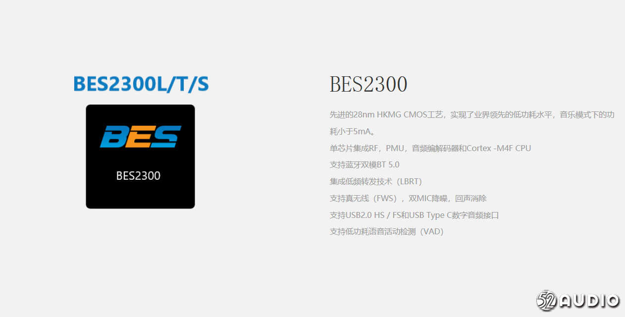 BES2300 是一款全集成自适应主动降噪方案,支持蓝牙 5.0、LBRT 低频转发技术和双模蓝牙 4.2,它还支持第三代 FWS 全无线立体声技术、双麦克风等,采用 28nm,BGA 封装。