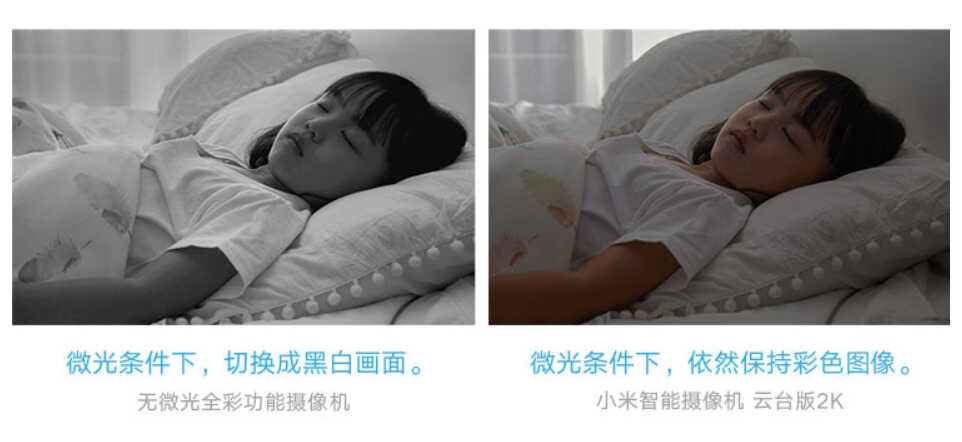 小米2K摄像头内置了940nm的红外补光灯,配合高感光灵敏度图像传感器,微光条件下也能呈现彩色图像。在没有任何光线的情况下,也会以黑白图像形式对家里进行监控。