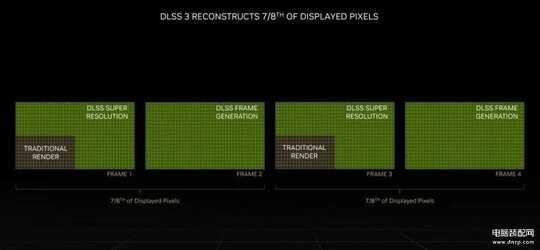 DLSS 3可直接生成游戏第1帧3/4的像素以及整个游戏第2帧,相当于使用1/8的算力,就完成了整个计算过程,而通过这一个流程的循环,可在提升帧数的同时节省资源开销,进一步带来更好游戏体验。