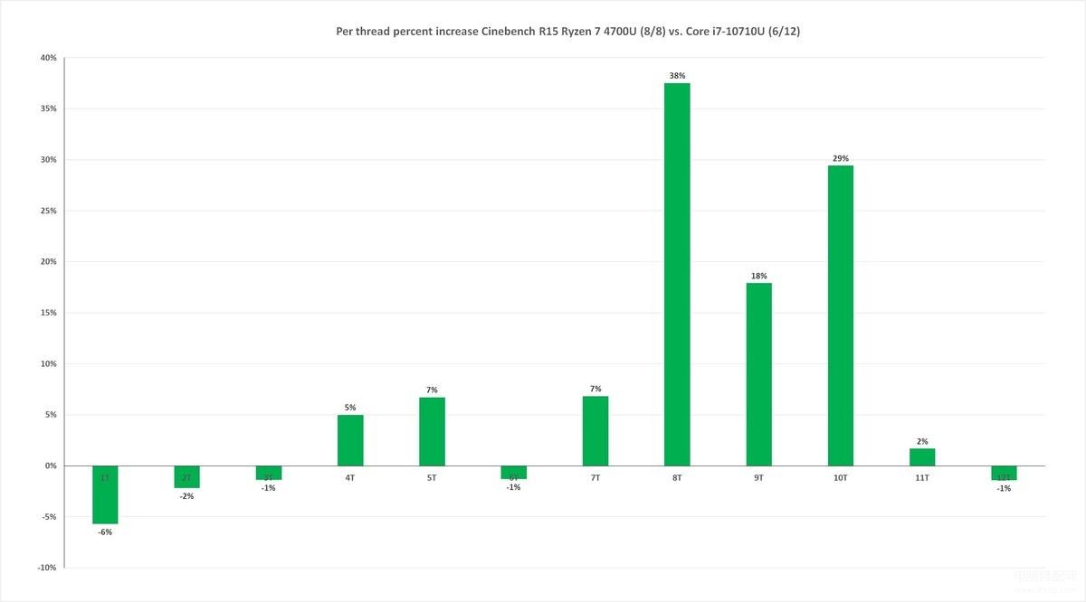 我们还在下面列出了性能差异。如您所见,锐龙7 4700U在那些轻负载下处在弱势,酷睿 i7-10710U的更高升压时钟在Cinebench R15中具有优势。而锐龙7 4700U在家用方面打开了很大的领先优势。尽管酷睿i7-10710U在测试中有12个线程支持更多线程,但只有8核的锐龙7 4700U与其齐头并进。尤其是考虑锐龙 7更好的GPU时,我们认为这是AMD的胜利。