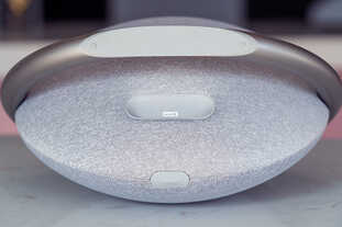音箱的正面哈曼卡顿的英语logo清晰直观,星环造型让用户可以使用顶部或底部两个把手区域通过单手拿起它,圆环把手为阳极氧化铝材质打造,非常的结实而且长久使用后也不易出现生锈的问题,音响本体则通过高级织物包裹起来,音响本体和圆环的位置是固定住的,并不能前后位移调整。同时由于该音响采用了星环设计的造型,因此它存在有2个不同位置的支撑点,并且支撑点也分别有防滑胶垫和磨平的设计,因此将其放置在桌面或地面上时重心也更加稳固。音响整体重量为3295g,虽然看着挺重的样子,不过实际拎起来还是相当轻松的,说是一款便携的大型蓝牙音箱也不为过,外出野营带上它是没什么问题的。