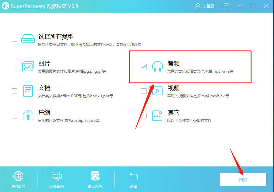 第三步然后点击音频选项并点击界面右下角的扫描按钮。