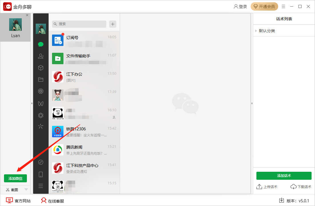 步骤三、如图,登录后,在左下角点击选择“添加微信”就可以了;