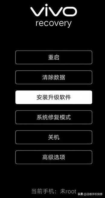 5.再次进入“recovery”模式,选择“安装升级软件”,界面会跳转,出现选择从“内置存储”还是“外置SD卡”升级。