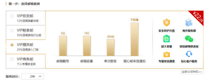 2. 点击注册之后,就会跳转到邮箱套餐页面,选择合适的邮箱套餐。总共有四种套餐:VIP极致邮、VIP畅享邮、VIP精英邮、VIP商务邮。VIP极致邮单次群发400封,无限容量。