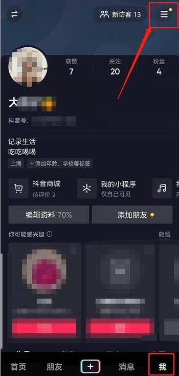 1、打开抖音进入我的页面后点击右上角【三】标志。