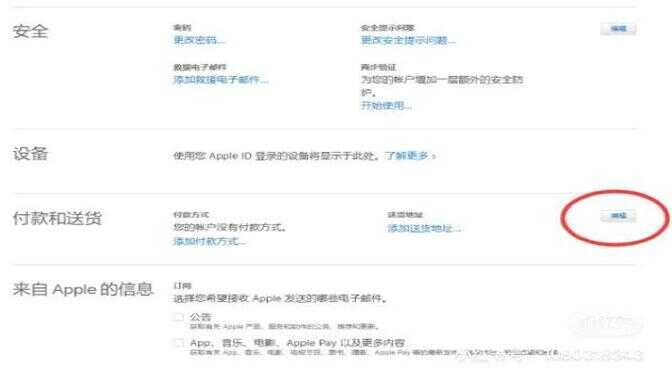 4, 回到苹果官网,右上角点账户,账户设置找到管理Apple ID,往下拉找到“付款和送货”这个大的项目,点击右侧的“编辑”.