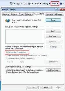 1.在ie浏览器里找到“internet选项”,在“连接”选项卡里,勾选"从不进行拨号连接"。