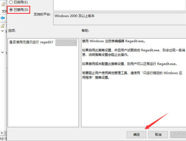 4.最后,将“阻止访问注册表编辑器”选项设置为已禁用即可。