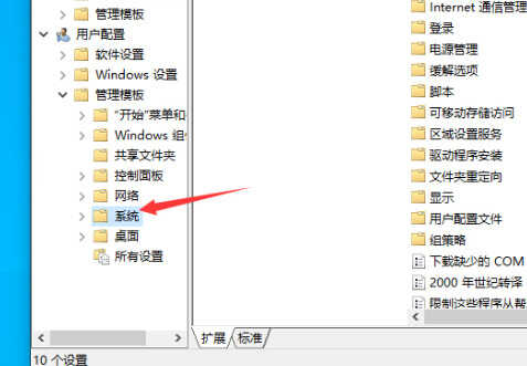 2.待本地组策略编辑器弹出后,在左侧边栏依次点击“用户配置”、“管理模板”、“系统”;