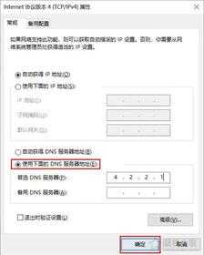 点击“使用下面的DNS服务器地址”,将首选DNS服务器修改为“4.2.2.1”或者“4.2.2.2”并点击确定,修改完毕之后我们就可以登录microsoft账户了。
