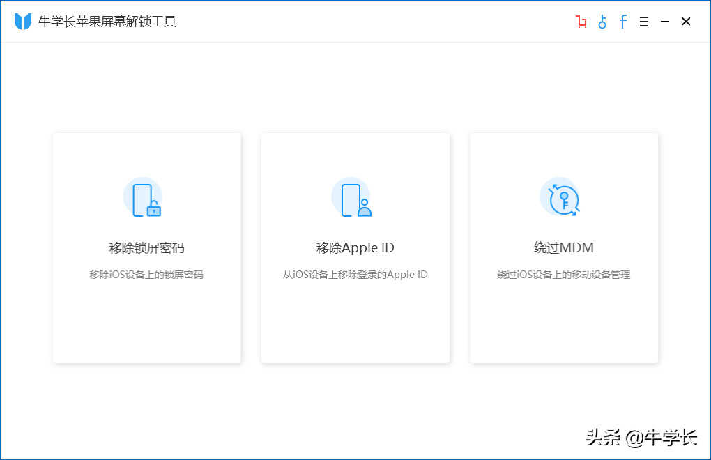 牛学长苹果屏幕解锁工具,轻松解锁iPhone屏幕锁、解锁Apple ID、移除MDM。轻松删除iPhone/iPad/iPod上当前登录的Apple ID账号。