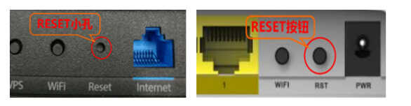 路由器的复位键有两种类型:RESET按钮和RESET小孔,如下图: