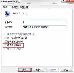 3、取消勾选“帐户已禁用”,点击确定,如下图所示: