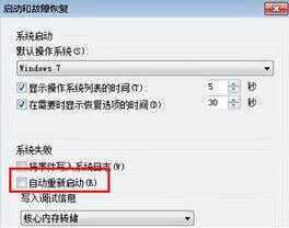 3、取消勾选系统失败下的“自动重新启动”选项,点击确定,如下图所示:
