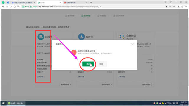 (6)注册地选择确定好以后,进入下一页面后再点击【订阅号】选项,然后在弹出的对话窗口中选择【确定】按钮