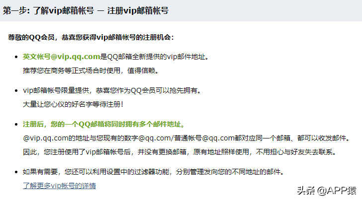如果你是QQ会员,那么还可以注册设置一个“注册账号名 + @vip.qq.com”格式的邮箱,推荐在商务正式场合使用。