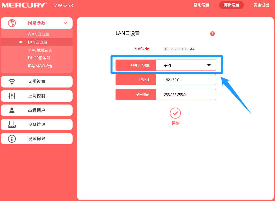 在详情页内将“LAN口IP设置”选项的模式改成“手动”,如下图: