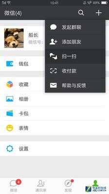 下一步打开你的手机微信你会看到在你的微信右上角有一个“加号+”用手指点击,会弹出下拉菜单,如下图。
