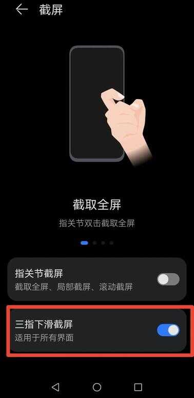 这里就会出现【指关节截屏】和【三指下滑截屏】,选择第2项【三指下滑截屏】,这个【三指下滑截屏特别的方便快捷,一秒就能截屏。然后点开旁边的按钮,显示有颜色就完成了。