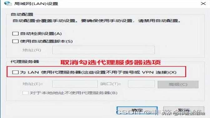 5.最后在弹出的窗口中,根据下图所示,先取消勾选【为LAN使用代理服务器XX】,接着点击【确定】选项。