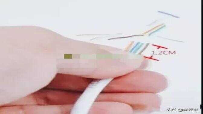 把网线外层绝缘皮剥开,露出里面的彩色绝缘皮——剥线时要注意力度,不要伤害到内层绝缘皮。