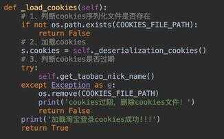 这一步我们需要先判断cookies文件是否存在,如果存在则读取cookies,之后再访问淘宝主页看看是否能成功,如果失败则说明cookies已过期,我们就删除cookies文件。