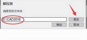 3.点击更改,选择解压目标文件夹,可在D盘或其它盘里面新建一个CAD2018文件夹,然后点击确定。