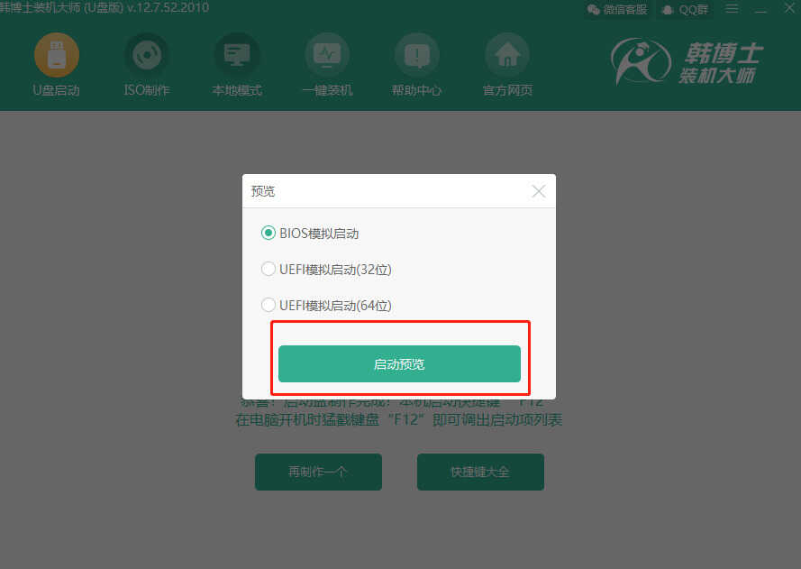 经过一段时间win10系统文件下载完成之后,韩博士又开始进入制作启动盘的状态。全程无需手动操作,等待启动盘制作成功之后韩博士会弹出以下窗口,直接点击"启动预览"开始测试启动盘是否成功制作。