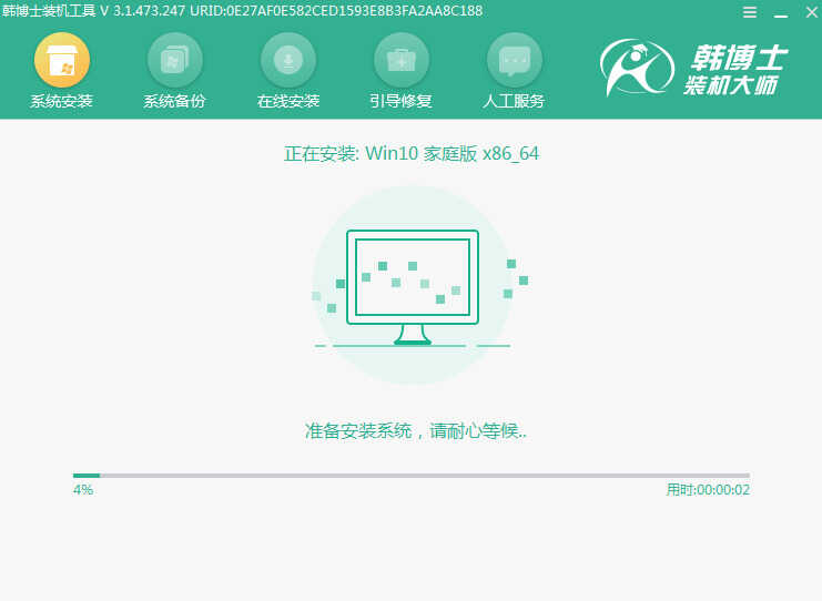依照提示进行操作,最后韩博士进入自动安装win10系统的状态,此过程无需我们手动进行操作,请大家耐心等待安装完成即可。